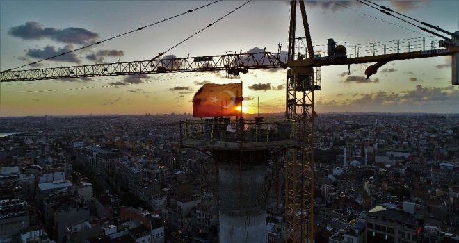 Kaba inşaatının ardından minarelerinin de bitme aşamasına geldiği Taksim Camiinin eşsiz manzarasıyla havadan çekilen gün batımı görüntüleri görenleri mest etti. Al bayrağın ardından batan güneş kartpostallık görüntüler oluşturdu.