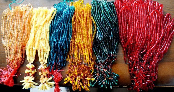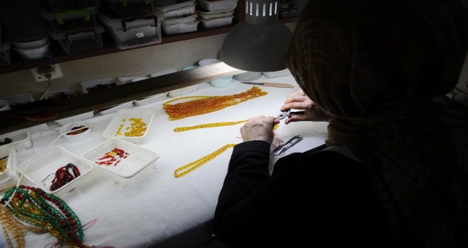 Bursada damla kehribar taşından yapılan tespihler, 3-4 bin TLden başlayan fiyatlarla satılıyor.