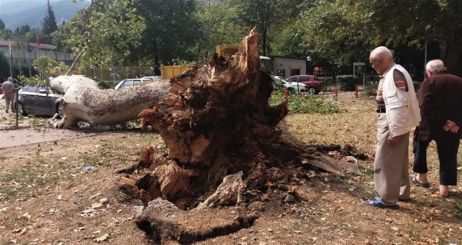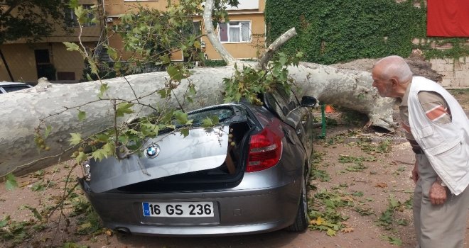 Bursanın tarihi surlarının dibinde bulunan 190 yaşındaki çınar ağacı köklerinin çürümesi nedeniyle büyük bir gürültüyle lüks otomobilin üzerine devrildi. Olayın gece saatlerinde olması muhtemel bir faciayı önledi.