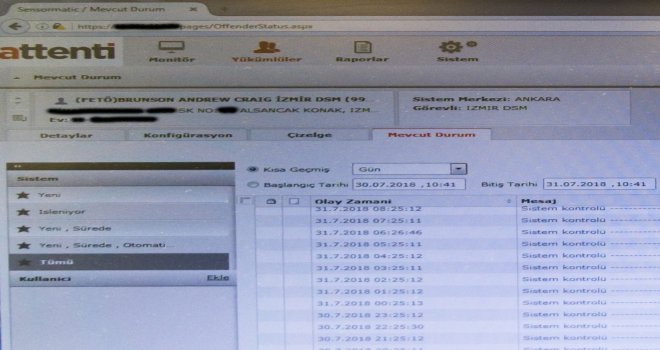 Ceza ve Tevkifevleri Genel Müdürlüğü Denetimli Serbestlik Daire Başkanlığı Elektronik İzleme Şube Müdürü Serkan Mutan, ABDli rahip Andrew Craig Brunsonla ilgili, “Şahsın cezaevinden tahliye edilmesinden sonra kişi konutuna geçirildi. Evinde ev ünitesi dediğimiz cihaz kuruldu ve ayağında bir kelepçe takılı şu anda. Bu cihaza dokunulduğunda ya da kelepçeye bir zarar verilmek istendiğinde sistem bunu görüyor ve merkezden haber alıyoruz. Bunun dışında aldığımız ek önlemler mevcut, bu şahısla ilgili olarak bu konuda özel eğitim almış iki tane personelimiz sadece bu şahsın izlemesini gerçekleştiriyor. Düzenli olarak denetimli serbestlikteki denetleme birimlerimiz şahsın evine giderek denetlemesini gerçekleştiriyor. Aynı zamanda kolluk birimleri de kişinin evi önünde güvenlik önlemleri almış durumda” şeklinde konuştu.