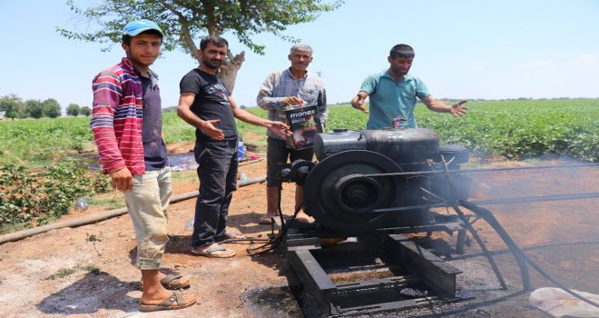 Şanlıurfanın Suruç ilçesinde bir çiftçi, kurumak üzere olan pamuk tarlasına su gelmeyince 1972 yılından kendisine miras kalan su motorunu tamir ederek geleneksel sulama yöntemiyle tarlasını sulamaya başladı.