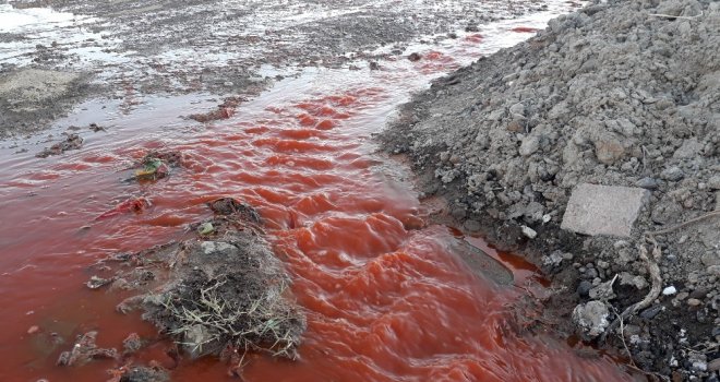 Gaziantepin İslahiye ilçesinde bir biber fabrikasının rögarı tıkanınca, mahalleyi kırmızı biber suyu bastı.
