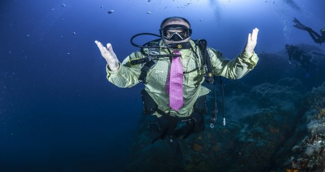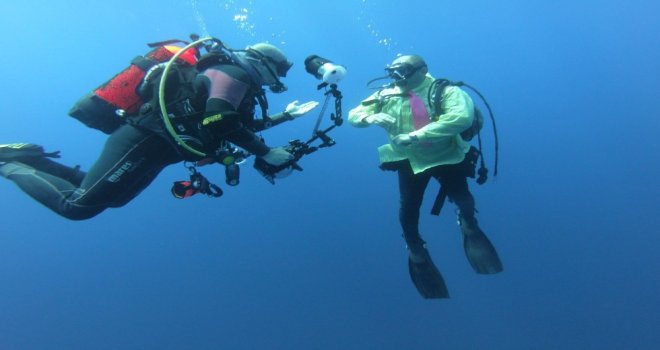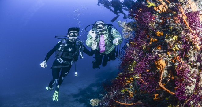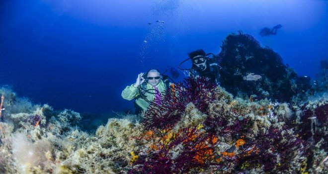 Ülkemizde sadece Ayvalıkta bulunan kızıl mercanlar keşfedilmeyi bekliyor. Dalgıçlar, mercanlara dikkat çekmek için kravat ve gömlekle denize daldı.