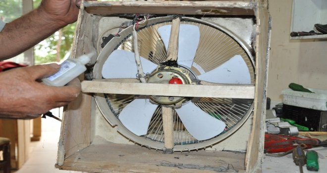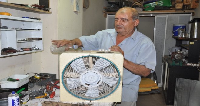 Manisada bir marangoz ustası sıcaktan bunalınca elektrikli vantilatörü arkasına sabitlediği otomobil radyatörü ile düşük maliyetli klima yaptı.180 liraya kendi klimasını kendisi üreten marangoz yarım litre suyla 16 saat boyunca serin havanın keyfini çıkarıyor.
