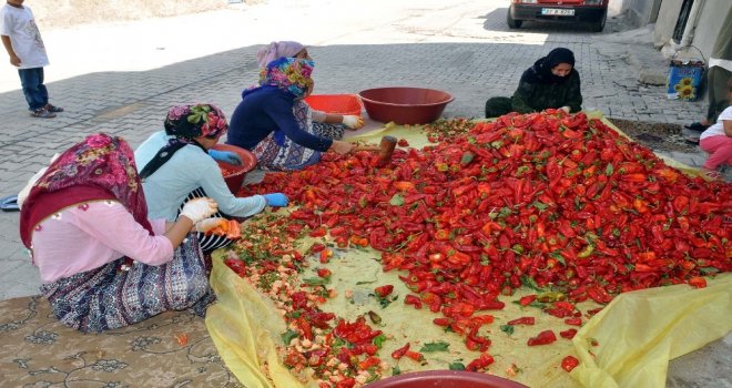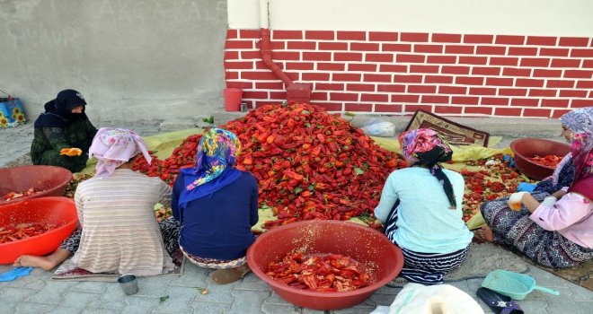 Öte yandan, bazı kadınlar isot sezonunda yevmiye karşılığı çalışırken, isot temizleme sırasında acıdan etkilenmemek için eldiven kullanıyor. Zahmetli bir şekilde yetiştirilen kırmızı isot, yöre kadınının maharetli ellerinden geçerek hem sofralara tat katıyor hem de kadınlara gelir kapısı oluyor.