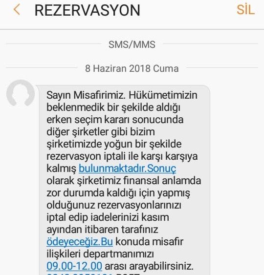 Şirketin geç kızın cep telefonuna attığı mesajda ise “Hükümetimizin beklenmedik şekilde aldığı erken seçim kararı sebebiyle diğer şirketler gibi bizim şirketimiz de yoğun bir şekilde rezervasyon iptaliyle karşı karşıya kalmış bulunmaktadır. Sonuç olarak şirketimiz finansal anlamda zor durumda kaldığı için yapmış olduğunuz rezervasyonlarını iptal edip iadelerinizi Kasım ayından itibaren tarafınıza ödeyeceğiz. Bu konuda misafir ilişkileri departmanını arayabilirsiniz” ifadelerinin yer aldığı mesaj atıldı.
