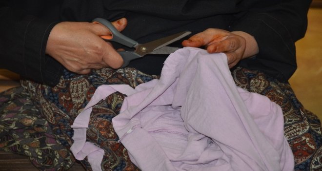 Eski kıyafetlerimizi kesip dokuma tezgahında kilim yapıyoruz