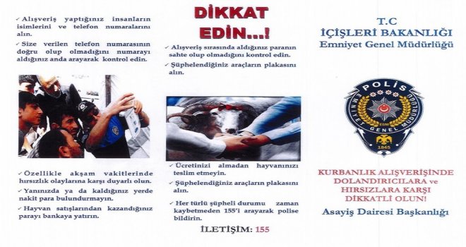 Emniyet Genel Müdürlüğü Asayiş Dairesi Başkanlığı, Kurban Bayramı nedeniyle Ankarada kurulacak olan kurban satış yerlerinde meydana gelmesi muhtemel dolandırıcılık ve hırsızlık olaylarının engellenmesi amacıyla bilgilendirici broşür hazırladı.