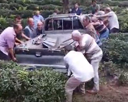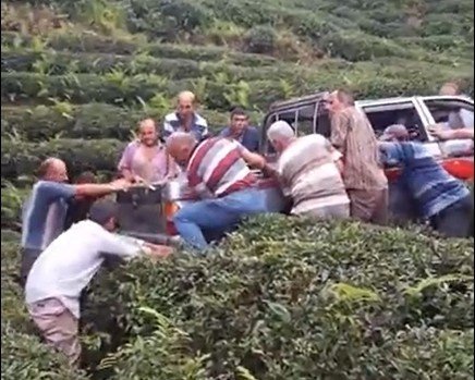 Aracın tarladan çıkartılması için çağırılan vinç operatörü arazi şartlarının aracı kurtarmaya elverişli olmadığını dile getirince, yaklaşık 20 kişilik grup aracı çay bahçesinden çıkarmak için yoğun bir çalışma başlattı. Vatandaşların bu gayreti ise bir başka köy sakini Muhammet Kan tarafından saniye saniye kaydedildi.