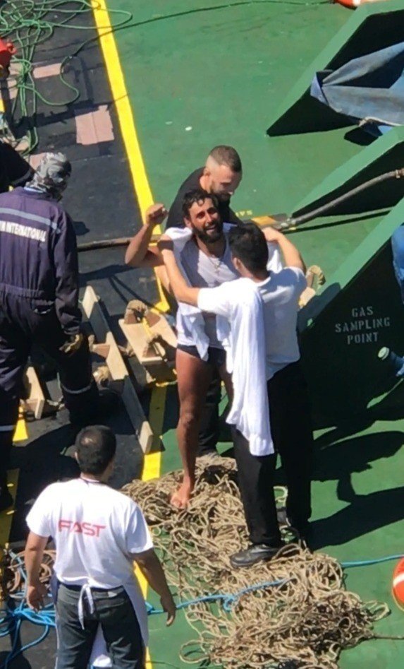 Yaşanan ilginç olay üzerine gemi mürettebatı çifte hemen yardım ederek gemiye aldı. Çift, kurtarıldıkları ilk an çok aç olduklarını, günlerdir yemek yemediklerini, su içmediklerini söyledi. Gemi mürettebatı ise sahil güvenlik ekiplerine haber verdi. Gemide yemek ve su verilmeyen çift sahil güvenlik ekipleri tarafından gemiden teslim alındı. Hastaneye kaldırılan çifte kontrollü olarak yemek ve su verildiği, sağlık durumlarının iyi olduğu öğrenildi.