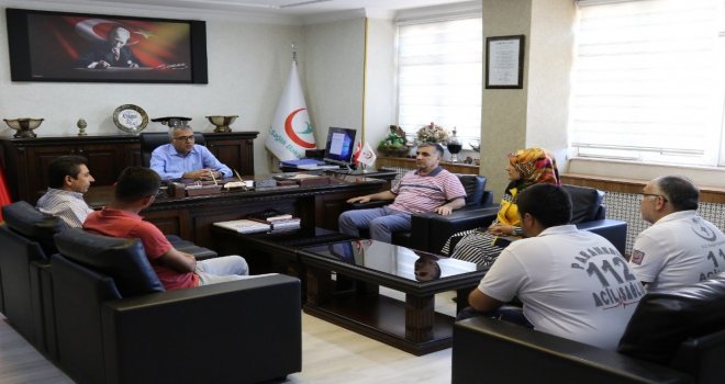 Adıyaman İl Sağlık Müdürü Uzm. Dr. Erdoğan Öz, Adıyamanda üst geçitten atlayarak intihar girişiminde bulunan genci son anda açtıkları hasta taşıma brandası ile kurtaran 112 acil sağlık ekiplerini makamında kabul ederek kendilerine teşekkür etti.