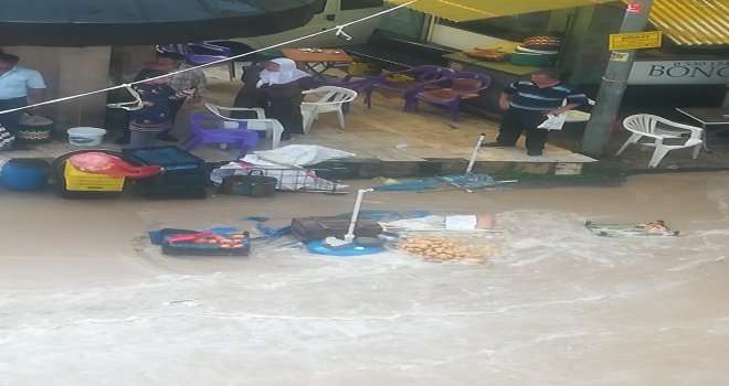 Afyonkarahisarın Sandıklı ilçesinde akşam saatlerinde başlayan sağanak yağış pazartesi pazarında sele neden oldu.