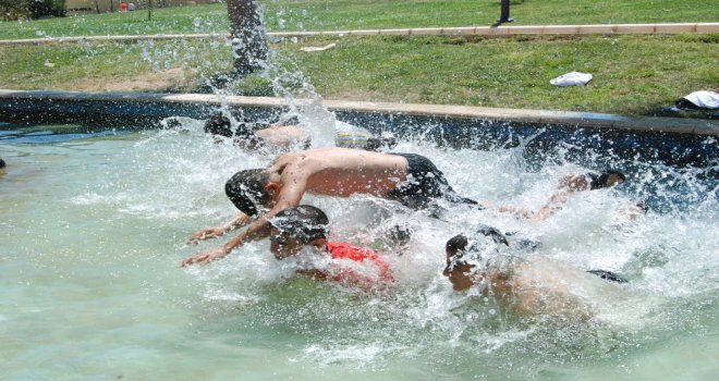 Şanlıurfada sıcaktan bunalan çocuklar, tüm uyarılara rağmen parklarda bulunan süs havuzlarına girerek serinledi.