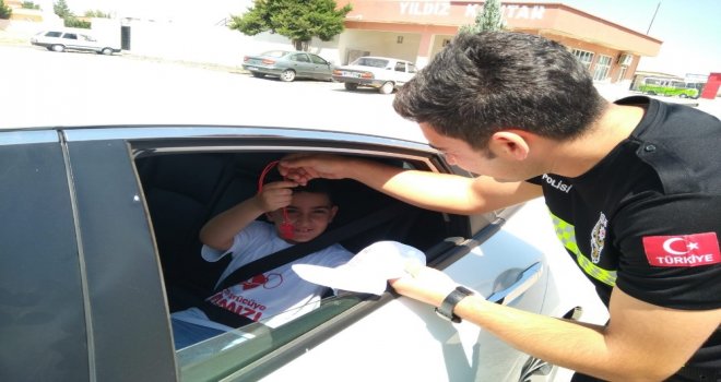 Polis ekipleri proje kapsamında uygulama noktalarında çocuklara kırmızı düdük, şapka, tişört ve el broşürü dağıttı.