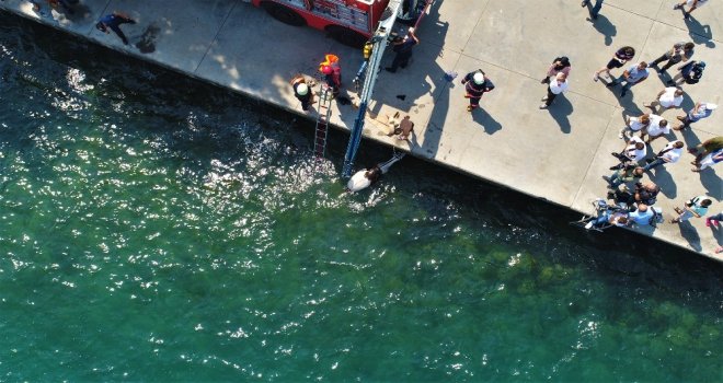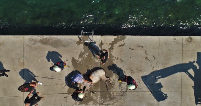Sariyerde Denize Düşen Atın Kurtarılma Anı Havadan Görüntülendi