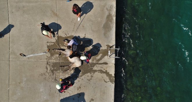 Ekiplerin uzun uğraş verdiği çalışmalar sonucunda at, vücuduna bağlanan halat yardımıyla kıyıya çıkarıldı. O anlar drone ile havadan görüntülendi.