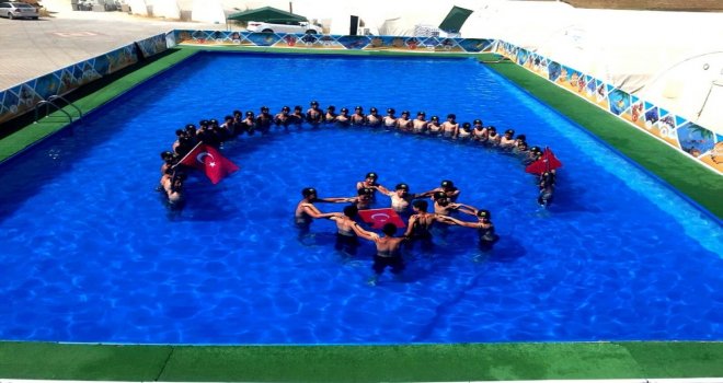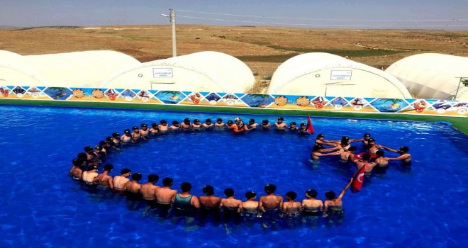 Sıcaklıkların yüksek olduğu Mardinde mülteci çocuklar havuzun ve sıcakların keyfini çıkarıyor. Bir gözlemci eşliğinde havuzda yüzme öğrenen mülteci çocuklar, azda olsa savaşın bıraktığı olumsuzlukları unutmanın sevincini yaşıyor. Mülteci gençler Mardin valisine bu güzel çalışması için teşekkürü Türk bayrakları ile yaparak havuz içinde oluşturdukları ay yıldız ile Türk bayrağını açarak sevinçlerini gösterdi.