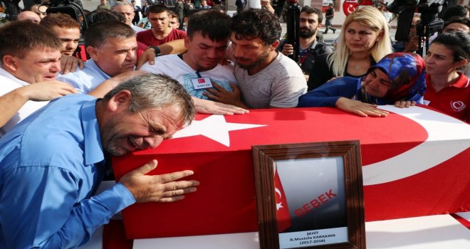 Hakkarinin Yüksekova ilçesinde aracıyla seyir halindeyken PKKlı teröristlerin önceden yerleştirdiği el yapımı patlayıcının infilak etmesi sonucu meydana gelen saldırıda şehit olan asker eşi Nurcan Karakaya ve oğlu Mustafa Bedirhan gözyaşları içerisinde memleketi Sivasın Şarkışla ilçesinde toprağa verildi.