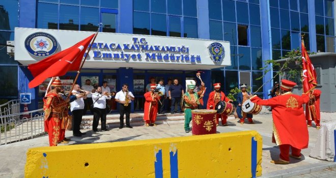 Muğlanın Ortaca ilçesinde, 15 Temmuz şehidi Adil Büyükcengizin kardeşi, Abdülkadir Büyükcengiz, darbe girişiminin yıl dönümünde mehteran eşliğinde İlçe Emniyet Müdürlüğünü ziyaret etti.