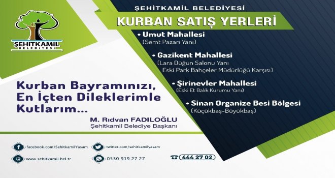 GAZİANTEP (İHA) Şehitkamil Belediyesi, ilçe genelindeki kurban satış yerleri ve kurban kesim yerlerini belirledi. Vatandaş, ikamet ettiği adrese en yakın kurban satış ve kesim yerini kullanarak kurbanını rahatlıkla kesecek.