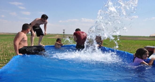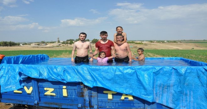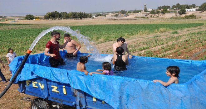 Mardinin Kızıltepe ilçesinde aşırı sıcaktan bulanan çiftçiler ilginç bir serinleme yöntemine başvurdu. Kızıltepe ilçesinde etkili olan aşırı sıcaklardan bunalan çiftçi ve köylüler, serinlemek için deniz ve göl olmayınca traktör römorkunu havuza çevirerek serinlemeye çalıştı.