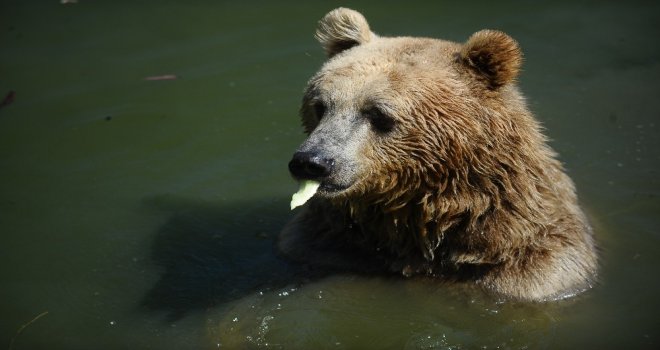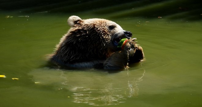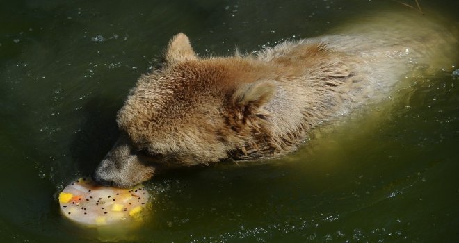 Bursa Büyükşehir Belediyesi Hayvanat Bahçesinin sevimli ayıları, görevlilerce verilen dondurulmuş meyvelerle serinliyor.