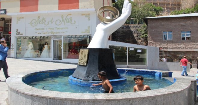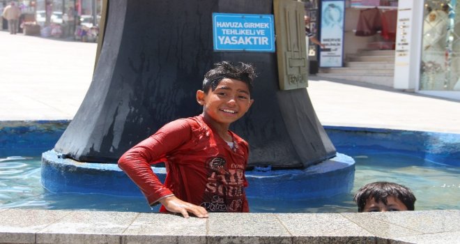 Hava sıcaklığının 27 dereceyi gösterdiği Erzurumda sıcaktan bunalan çocuklar Taş Mağazalar Caddesinde bulunan süs havuzunda serinliyor. Havuza giren ve etrafında güneşlenen çocuklar, fıskiye altında oyunlar oynayarak serinlemeye çalışıyor.