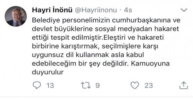 Hayri İnönü attığı tweette Belediye personelimizin Cumhurbaşkanına ve devlet büyüklerine sosyal medyadan hakaret ettiği tespit edilmiştir. Eleştiri ve hakareti birbirine karıştırmak, seçilmişlere karşı uygunsuz dil kullanmak asla kabul edebileceğim bir şey değildir. Kamuoyuna duyurulur ifadelerini kullandı. Cumhurbaşkanı Erdoğanın avukatlarının tweet ile alakalı savcılıktan işlem başlatılmaz ise suç duyurusunda bulunacakları öğrenildi.