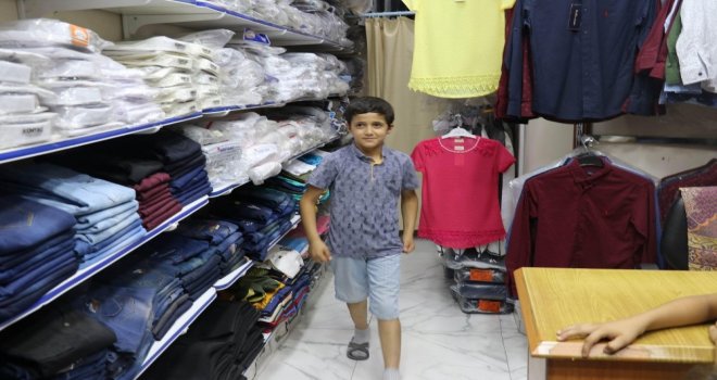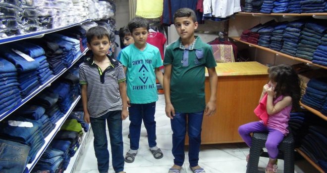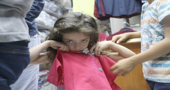 Giysi ve ayakkabı dükkanına giren çocuklar, istedikleri ürünleri alıp denedi. Çocukların mutluluğu gözlerinden okundu.