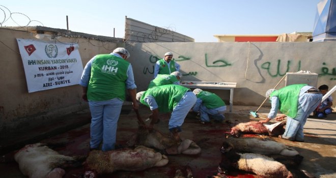 “Paylaştığın senindir” sloganıyla Kurban Bayramında da çalışmalarını yürüten İHH İnsani Yardım Vakfı, Suriyenin Afrin, İdlib, Halep, Hama, Humus, El Bab, Cerablus ve Azez bölgelerinde yaşayan ihtiyaç sahibi ailelere yardımlar ulaştırdı. 5 bin 357 hisse kurban kesilerek yardıma muhtaç insanlara dağıtımı yapılmaya başlandı. Kurban Bayramı boyunca dağıtımı devam edecek etlerden yaklaşık 215 bin kişi istifade edecek.