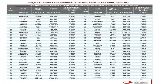 İç savaştan kaçarak, Türkiyeye gelen ve daha sonrada çeşitli nedenlerle Türkiyede kalan Suriyeli göçmenler, Türkiyenin 81 iline dağıldı. Ülkede geçici korunma kapsamındaki Suriyeli sayısı, Temmuz 2018 verilerine göre bir önceki yıla göre artış göstererek 3 milyon 541 bin 572 oldu. Verilere göre, geçici barınma merkezlerinde kalan Suriyeli sayısı ise 210 bin 177 kişi olarak kaydedildi.