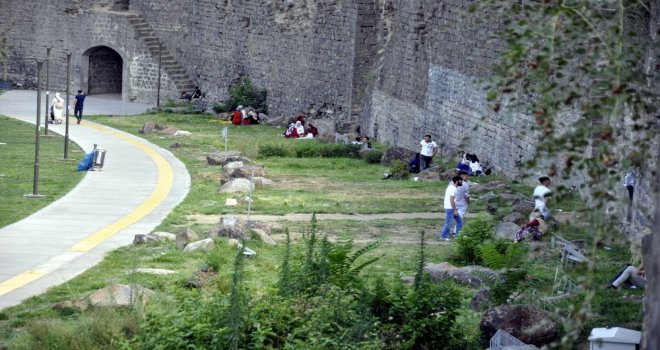 Surlardan düşen taşların tehlike oluşturabileceği duyuru ve tabelalarına aldırış etmeyen vatandaşlar, serin olan sur diplerinde saatlerce oturuyor, bazıları ise uyuyarak vakit geçiriyor.