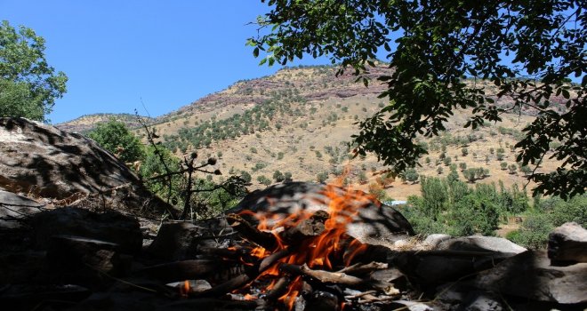 Hakkarinin Şemdinli ilçesine bağlı Irak sınırının sıfır noktasında bulunan Derecik beldesinde terörden temizlenen Balkaya Dağlarının eteklerine çıkan gençler, piknik yaparak nargile içiyor.