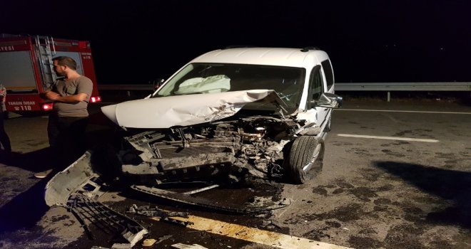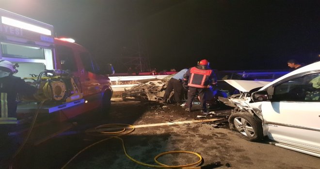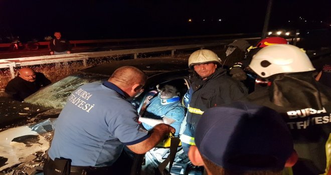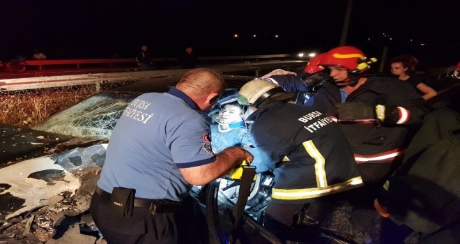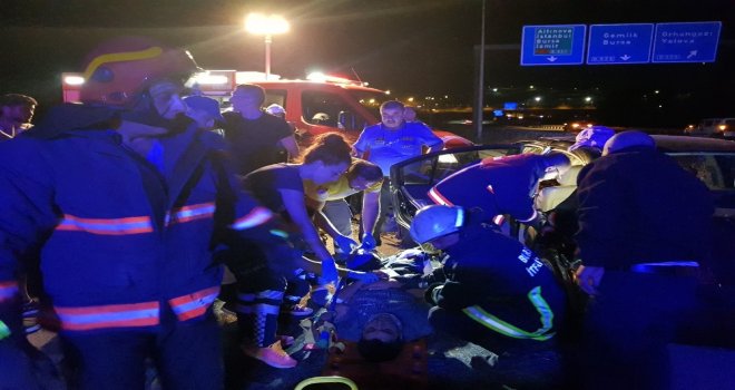 Edinilen bilgiye göre, karsak kavşağından girip İznik istikametine seyr eden Abdullah Yılmaz (59) idaresindeki 16 MAR 62 plakalı hafif ticari araç, bölünmüş yolda ters şeritten gelen Önder Küçük (37) yönetimindeki 16 LF 060 plakalı otomobil ile kafa kafaya çarpıştı. Çarpmanın şiddeti ile savrulan otomobil bariyerlere çarparak durabildi. Olay yerine bölgeden ambulans, itfaiye ve güvenlik güçleri sevk edildi. Otomobilde sıkışan sürücü Önder Küçükün kurtarılması için çalışma başlatılırken, yaralanan Nazlı Küçük (27), çocukları Emirhan Küçük (6), Duru Küçük (4), Arzu Küçük (2) ve eltisi Gönül Küçük (33) ise ambulansla Orhangazi Devlet Hastanesine kaldırıldı. Yaralanan hafif ticari araç sürücüsü Abdullah Yılmaz da Gemlik Devlet Hastanesine kaldırıldı.