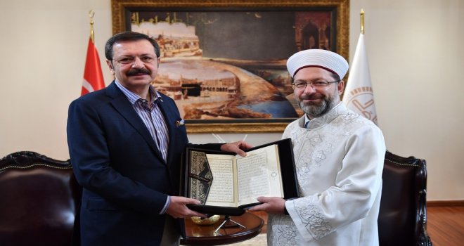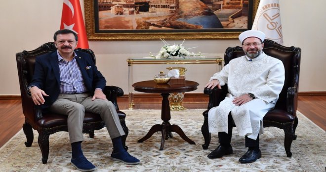 Diyanet İşleri Başkanı Prof. Dr. Ali Erbaş, Türkiye Odalar ve Borsalar Birliği Başkanı Rifat Hisarcıklıoğlunu kabul etti. Ziyaretten duyduğu memnuniyeti dile getiren Diyanet İşleri Başkanı Erbaş, Hisarcıklıoğluna teşekkür etti.Erbaş, camiler, Kuran kursları, okullar gibi millete hizmet eden pek çok müessesenin yapımında ticaret erbabının çok büyük desteğinin olduğunu söyledi. Allah rızası için infak etmenin önemine değinen Başkan Erbaş, “Sizlerin bu noktadaki hareketini görmek bizi çok mutlu ediyor. Rabbim bütün mazlumların, mağdurların yanında yer almayı hepimize nasip eylesin” dedi.