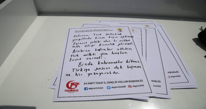 Amaçlarının 15 Temmuzun unutulmamasını sağlamak olduğunu söyleyen Ak Parti Tokat Gençlik Kolları Başkanı Mesut Aktürk; “Burada halkımıza 15 Temmuzun yıldönümünde halkımıza yaşananları dakika dakika anlatmaya çalıştık. Bu noktada saat saat burada yaşadıklarımızı anlatarak insanların o duyguyu tekrardan hissetmesini sağladık. Çünkü bizler ne zaman darbe ile ilgili bir takım şeyleri insanların unutacağı anda o kara geceyi tekrar hatırlatarak asla ve asla içimizden o hissi içimizden çıkarmamız gerektiğini insanlara göstermek istedik. İnsanlarımız o gece ile alakalı 15 Temmuz 2016 ile alakalı duygu ve düşüncelerini yazmaları açısından böyle bir defter çalışması yaptık. Bunu da biz her sene geleneksel olarak yapacağız. Birinci yılında yapmıştık, bugün ikinci yıl. Onları da bir kitap haline getiriyoruz şeklinde konuştu.
