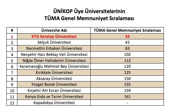 Üniversite Araştırmaları Laboratuvarı (ÜniAr) tarafından yapılan ve Türkiyedeki üniversite öğrencilerinin üniversite deneyimleri hakkında geniş bir bakış açısı sunan Türkiye Üniversite Memnuniyet Araştırmasında (TÜMA) Konya Ticaret Odası (KTO) Karatay Üniversitesi üst sıralarda yer aldı.