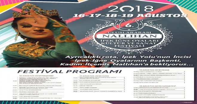 İpek Yolu üzerinde bulunan, ipek iğne oyalarının Başkenti olarak bilinen ve doğal güzellikleri ile tanınan Nallıhan ilçesi, 16-19 Ağustos tarihleri arasında yapılacak festival için gün sayıyor. Türk kültürünün en güzel örneklerinden biri olan ipek iğne oyasının unutulmaması için bu festivali düzenlediklerini belirten Nallıhan Belediye Başkanı İsmail Öntaş, unutulmaya yüz tutmuş meslekleri yeniden canlandırmayı amaçladıklarını da söyledi.