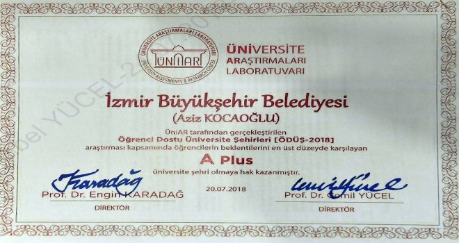 Üniversite Araştırmaları Laboratuvarı (ÜniAr) tarafından yapılan ve Türkiyedeki üniversite öğrencilerinin üniversite deneyimleri hakkında geniş bir bakış açısı sunan Türkiye Üniversite Memnuniyet Araştırmasına (TÜMA) İzmir damgasını vurdu. İzmir Büyükşehir Belediyesi tarafından üniversite şehri olma yolunda gerçekleştirilen uygulamaların da önemli etkisiyle İzmir, 81 ildeki üniversite öğrencilerinin katıldığı Öğrenci Dostu Üniversite Şehirleri (ÖDÜŞ) araştırmasında, &o uml;ğrencilerin beklentilerini en yüksek düzeyde karşılayan “A Plus Üniversite Şehri unvanını aldı.