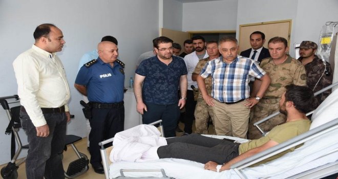 Hakkâri Valisi Cüneyit Orhan Toprak, Yüksekova ilçesinde bölücü terör örgütü mensuplarınca yapılan hain saldırısı sonucu yaralanan 6 polis memurunu tedavi gördüğü hastanede ziyaret etti.