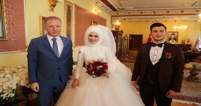 Yeni evlenen çiftin talebini geri çevirmeyen Sivas Valisi Davut Gül, makamında düğün fotoğrafı çektirmelerine izin verdi.