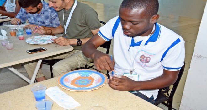 Dünyanın dört bir yanından Bursaya gelen yabancı misafirler, BUSMEK Merinos Kurs Merkezinde çini tabak boyadı, Mesleki Eğitim Merkezinde dolma sardı, mantı ve pasta yaptı.