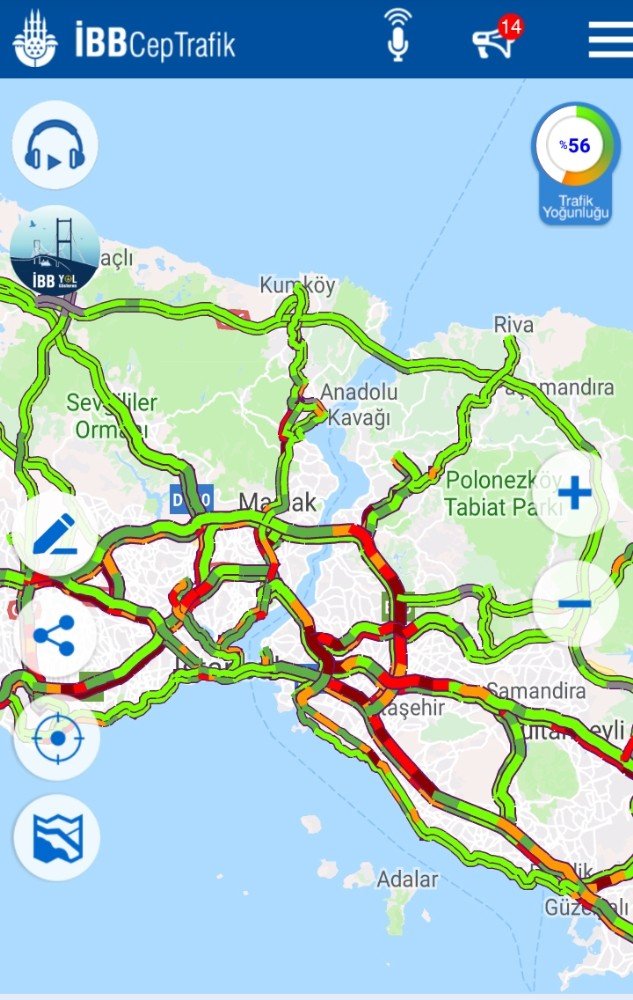 Yetkililerin dün yaptığı uyarıların ardından akşam saatlerinden itibaren Trakya üzerinden İstanbula giriş yapan yağmur etkisini göstermeye devam ediyor. Akşam saatlerine kadar devam etmesi beklenen yağmur, araçları ile mesaiye gidenleri olumsuz etkiledi. Birçok vatandaş yola tedbirli çıkarken, E-5te uzun araç kuyrukları oluştu. Yağmur zaman zaman etkisini artırarak sürerken, İstanbul Büyükşehir Belediyesi (İBB) trafik yoğunluk haritasında yüzde 56lılara varan araç trafiği olduğu görüldü.