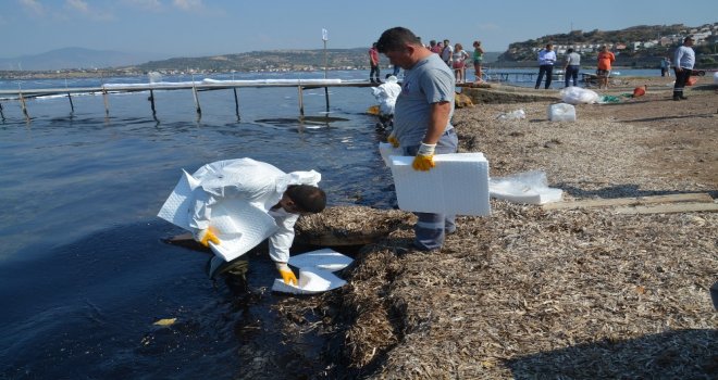 İzmirin Foça ilçesinde, denizde meydana gelen ağır yakıt türü araştırılırken, ekipler denizde sızıntının daha fazla alanı kaplamaması için canla başla mücadele veriyor.