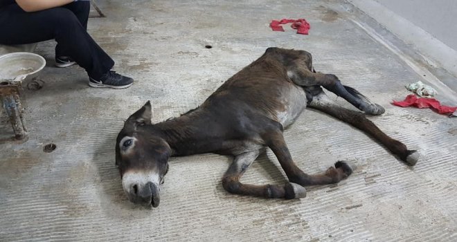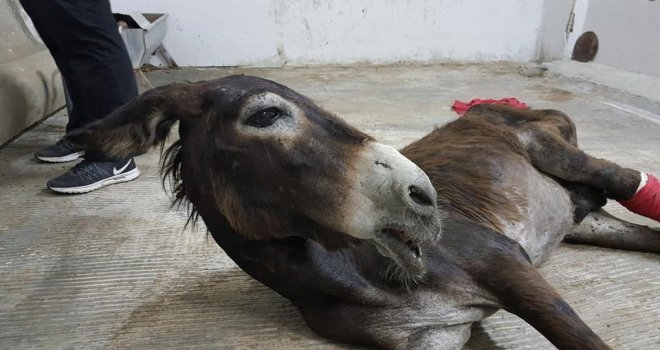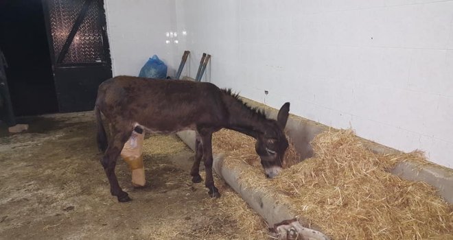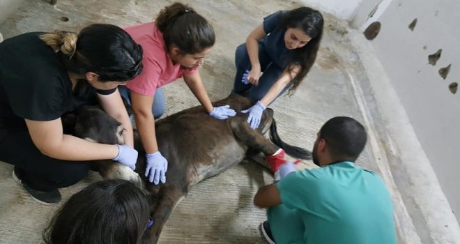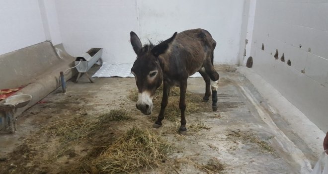 Aydının Efeler ilçesinde yaralı halde bulunan eşek, Adnan Menderes Üniversitesi (ADÜ) Veterinerlik Fakültesinde tedavi altına alındı. Yapılan muayenede, eşeğin ateşli silahla vurulduğu ve sol arka bacağında parçalı kırık oluştuğu belirlendi. Genel sağlık durumu iyi olan hayvanın, yaralı ayağı bandaja alındı. Gözetim altında tutulan hayvanın ayağının, kendiliğinden iyileşmemesi durumunda ameliyat edileceği belirtildi. Eşeğin, tedavi masraflarını ise Hayvan Hakları Federasyonu (HAYTAP) üstlendi. Her gün düzenli olarak hayvanın bakımı ile ilgilenen hayvan severler yaralı eşeğe çocuk gibi bakıp, kendi elleriyle karpuzla ve samanla besliyor.