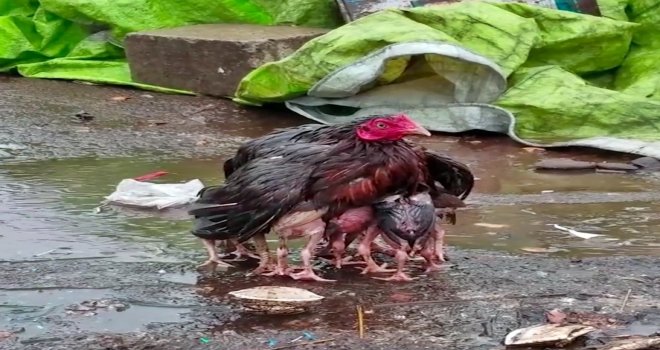 Hindistanın Visakhapatnam şehrinde bulunan bir balık pazarında çekilen görüntüler sosyal medya platformlarında ilgi odağı haline geldi. Paylaşılan görüntülerde anne tavuğun yavrularını sağanak yağmurdan korumak için vücudunu ve kanatlarını bir şemsiye gibi açtığı görülüyor. Görüntü kısa süre içerisinde yayılırken anne tavuğun bu davranışı sosyal medya kullanıcılarının takdirini topladı.
