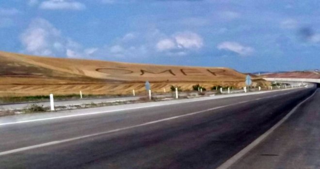 Edinilen bilgilere göre, Alaca sanayi sitesinde esnaf olan Mesut Turanın kardeşi Ömer Turan (23) 2010 yılında tedavi gördüğü hastanede hayatını kaybetti. Kardeşinin ölümüyle sarsılan Turan, o günden itibaren her yıl tarlasındaki ürünü biçtikten sonra, traktörüne taktığı pulluk yardımıyla sürdüğü tarlasına Ömer ismini yazıyor. Tarlada devasa boyutta yazılan “Ömer” yazısını gören vatandaşlar ve sürücüler şaşkınlığını gizleyemiyor.