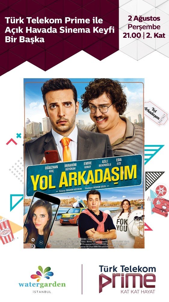 Yaz boyunca Watergarden İstanbulda Türk Telekom Prime ile gerçekleşen Açıkhava Sinema programının bu haftaki konuğu gişe rekorları kıran komedi filmi Yol Arkadaşım olacak.