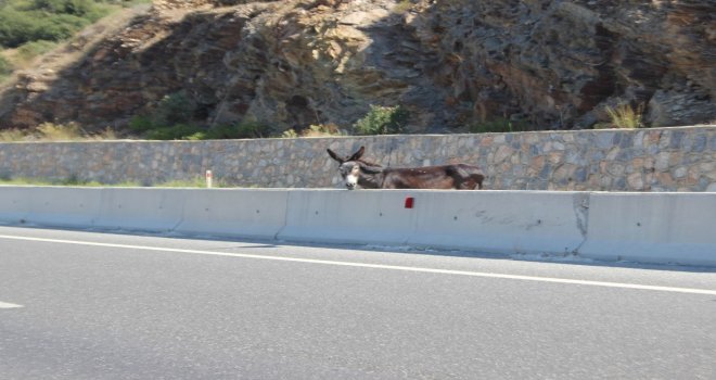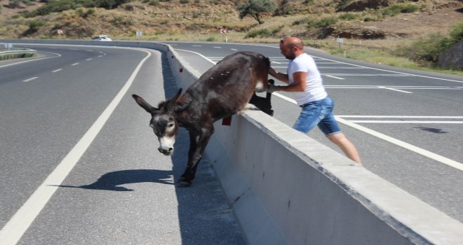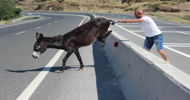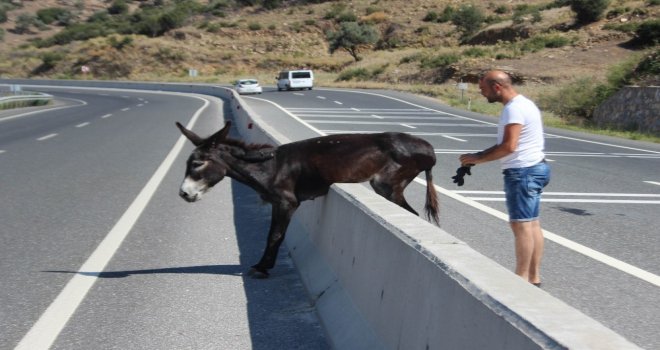 Çine-Muğla Karayolunda mahsur kalan bir eşek yardımsever bir gencin uzun uğraşları sonucu kurtarıldı. Hızla akan trafikte ve askıda kaldığı orta refüşden kurtarılan eşek yolun karşısında kendisini bekleyen arkadaşları ile gözlerden kayboldu.