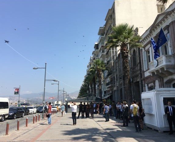 Dışişleri Bakanı Mevlüt Çavuşoğlu ve Yunanistan Dışişleri Bakanı Nikos Kociasın Yunanistanın yenilenen İzmir Başkonsolosluğu binasının açılışı sırasında İzmirin düşman işgalinden kurtuluşunun 96. yıldönümü için havalanan F-16 uçaklarının sesleri bina yakınlarından da duyuldu. Konak Bakan Nikos Kocias, F-16ları elleriyle göstermesi üzerine Çavuşoğlu, Bizi hedef almıyorlar endişelenmeyin dedi.